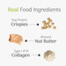 Crunchy Crisps (29%) (soy protein crisps (17%) (soy protein isolate, tapioca starch), rice crisps (12%) (rice flour, rice bran, sugar, rice extract), peanuts (28%) (peanut paste, roasted nibbed peanuts, peanut flour), chicory root syrup, dates, bovine hydrolysed collagen (8%), cacao nibs, sea salt (0.3%)